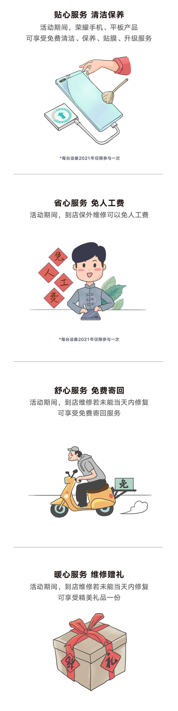 除了线下授权服务中心外,用户还可前往荣耀官网服务日专属页面,通过7*24小时普通话客服热线、在线客服或荣耀客服官方微博/微信公众号进行预约或查询。与第三方平台或者非正规服务方不同,“荣耀服务日”活动不仅具备官方正品正规优势,成本也更加可控,维护维修成本风险均降至最低,具有显著的人性化优势。