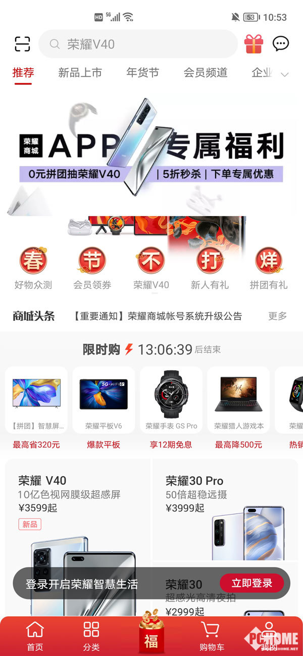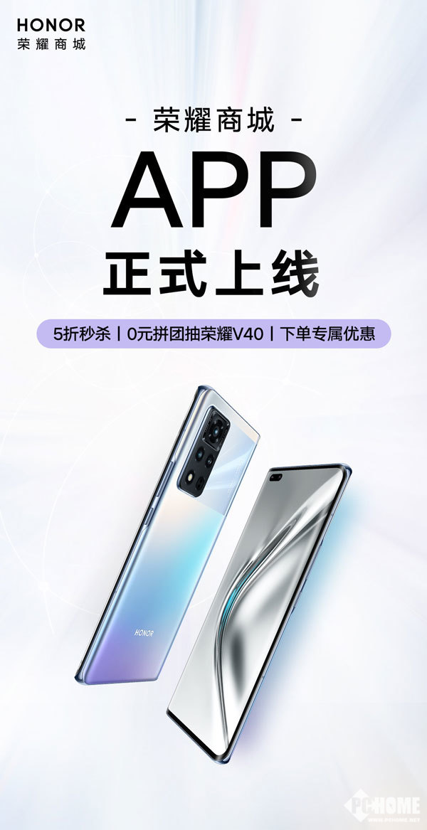 【PChome手机频道资讯报道】2021年,新荣耀携首部旗舰机荣耀V40扬帆起航,继续推进构建5G智慧生态。为满足广大荣耀用户的购机与服务需求,全新的荣耀商城APP于2月8日正式上线。用户下载荣耀商城APP可享爆款好物5折秒杀、0元拼团抽荣耀V40等优惠,更有机会获得荣耀笔记本。