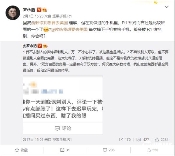 罗永浩回复:“理解,但在我做过的手机里,R1相对而言还是比较难看的一个了”。
