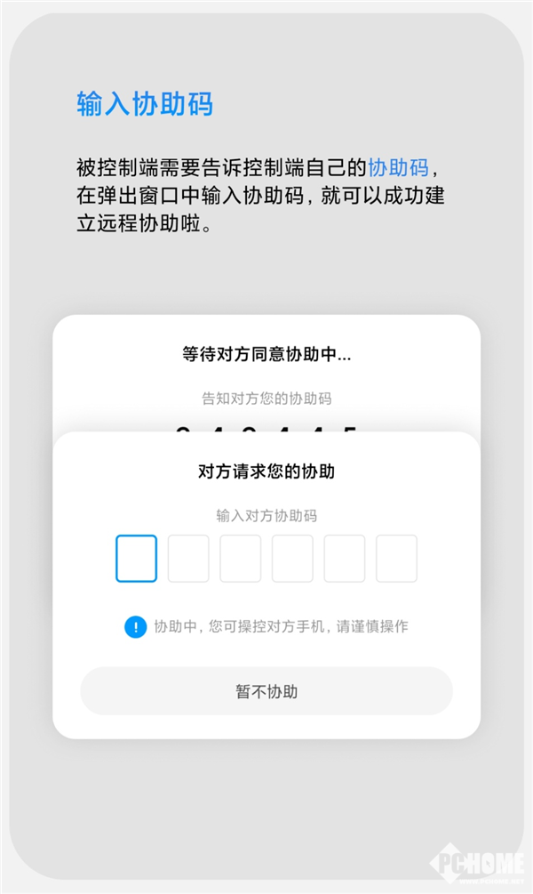 最后,被控制端需要告诉控制端自己的协助码,在弹出窗口中输入协助码就可以成功建立远程协助。