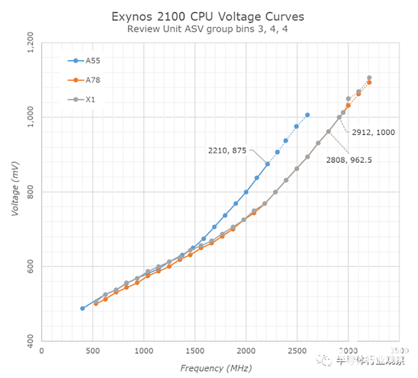 进一步有趣的数据是Exynos 2100上CPU的电压曲线。我已经提取了我的两个设备(常规的S21和S21 Ultra)的频率电压表,以上曲线是较小的S21内部更好的分箱芯片。