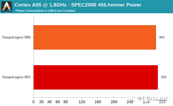 使用SPEC的456.hmmer –因为它是主要位于较低缓存层次结构中的工作负载,因此,我们避免了可能不同的内存子系统的任何影响,我们可以看到两个SoC的功耗的确几乎相同,而性能也得分为6.84对6.81,而新款Snapdragon 888则相同。