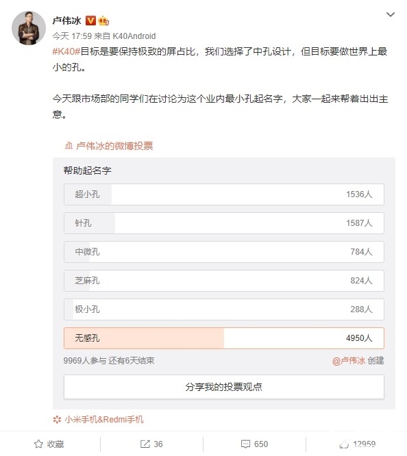 另外,卢伟冰此前还曾宣布,Redmi K40系列系列将采用居中挖孔设计,孔径非常小,官方称他们的目标就是做到世界上最小的挖孔屏。