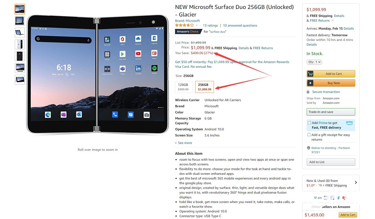 此前微软Surface Duo曾因上市一个半月暴降200美元而备受争议,如今价格已经跌了400美元。