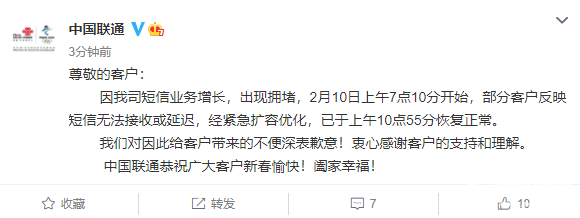 “尊敬的客户:因我司短信业务增长,出现拥堵,2月10日上午7点10分开始,部分客户反映短信无法接收或延迟,经紧急扩容优化,已于上午10点55分恢复正常。