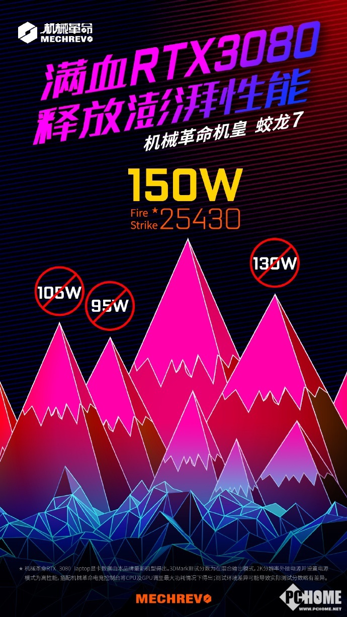 机械革命官方的数据显示,150W 性能释放的 RTX 3080 3DMark Fire Strike 跑分 25430 分,明显高于 95W 到 130W 性能释放的型号。