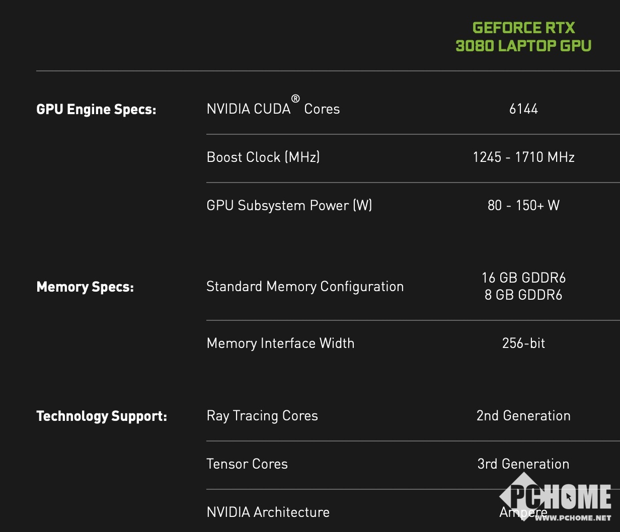 英伟达 RTX 3080 移动显卡拥有 6144 CUDA 核心,在 80 到 150W 的功耗下,Boost 频率在 1245 到 1710MHz。英伟达 RTX 3080 移动显卡有 16GB 显存和 8GB 显存两个版本。