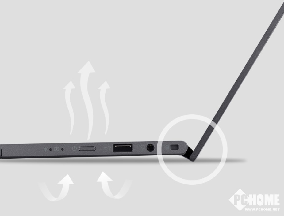 宏碁新款 Spin5 笔记本十分轻薄,厚度仅为 14.9mm,重 1.2kg。屏幕转轴采用下沉直角设计,便于在打开有抬高机身,有利于散热。电脑搭载 53 叶片风扇、8mm 热管,提升散热效率。