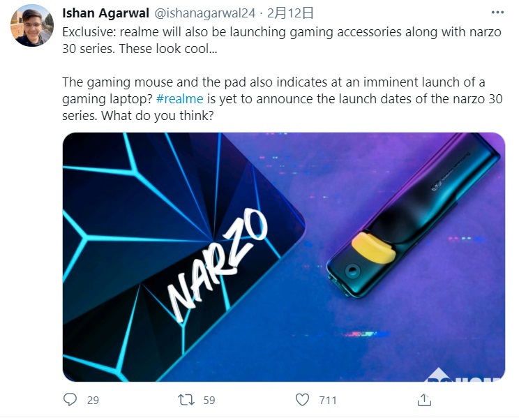推特博主 @ishanagarwal24 近日发出消息,他公布了一张官方海报,展现了 Narzo 游戏鼠标以及鼠标垫。表示realme 不仅要发布 Narzo 手机,也要同时发布该系列外设产品,包含鼠标、键盘等。