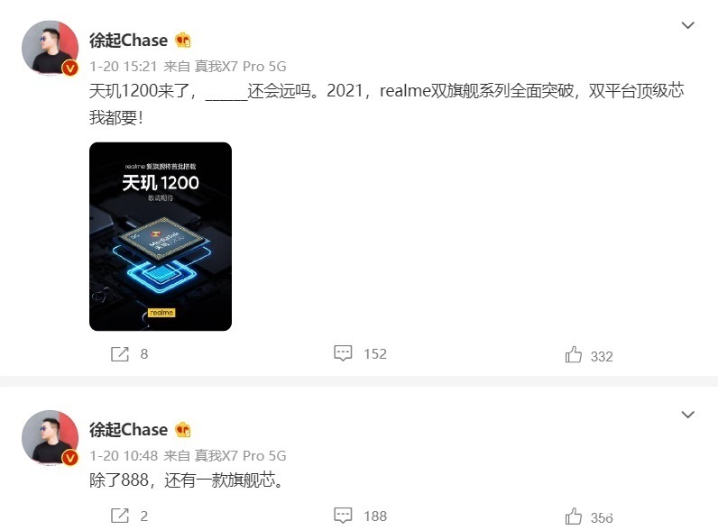 另外,realme 副总裁、中国区总裁、全球营销总裁徐起上个月在微博透露,realme 将会有另一款搭载天玑 1200 的旗舰手机发布。