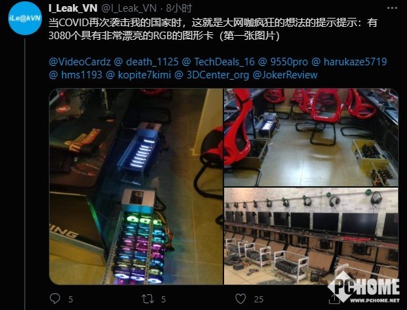 据晒出的图片来看,这家网吧拥有数量众多的RTX3080显卡,且图中的大量电脑都被改成了矿机,利用RTX3080显卡进行挖矿。