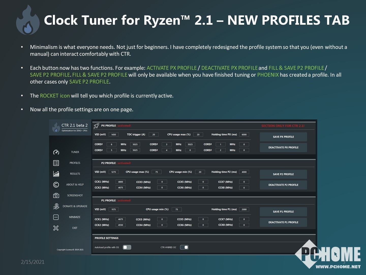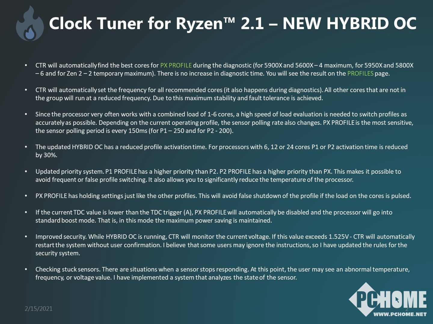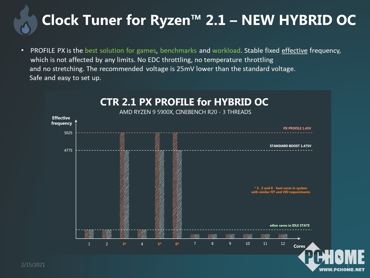 CTR 2.1 提供了全新的 Hybrid OC 模式。其中带来的 PX Profile 配置文件最适合游戏、跑分等常规用途。该配置方案提供稳定的频率输出,不受任何温度限制影响。用户使用 PX 模式可以保证降压超频的性能,简单易用。