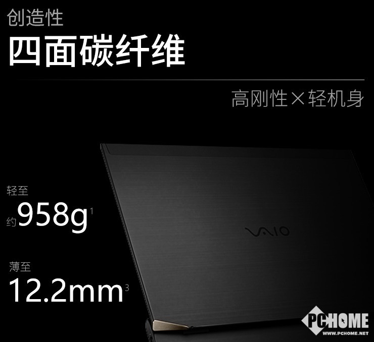 VAIO Z 2021笔记本在机身方面,采用了兼顾轻量和强韧的碳纤维材料,实现碳纤维自然包裹机体,机身重量约958g,薄至12.2mm³。