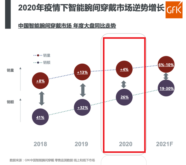 GfK表示虽然疫情导致智能腕间穿戴设备市场增速放缓,但也正因为此,疫情让更多人更加关心自己的健康,所以越来越多的用户选择智能腕间穿戴设备。此外,更多的厂商正在不断地加强市场布局,用户对智能腕间穿戴产品有了更多的认知以及关注度。