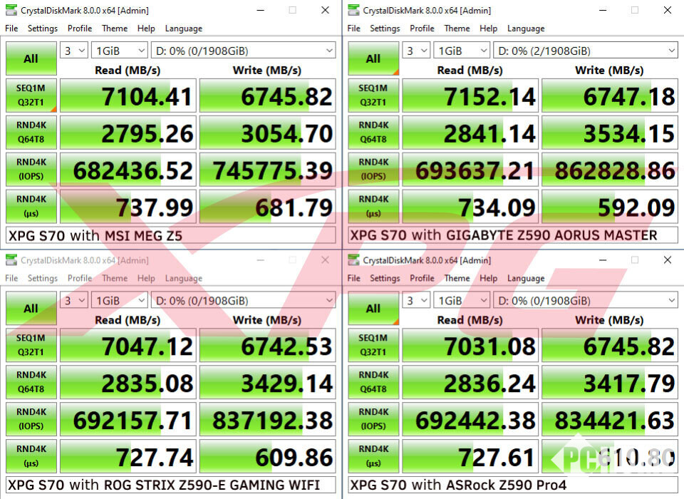 此外,威刚还在同样的平台测试了 GAMMIX S70 PCIe Gen4x4 固态硬盘。CDM 结果显示,这款 NVMe 硬盘连续读取速度可达 7100MB/s,连续写入速度为 6745MB/s,4K 随机读写可达 70 万 IOPS 左右。这款固态硬盘的速度接近 PCIe 4.0×4 接口上限,目前属于第一梯队。