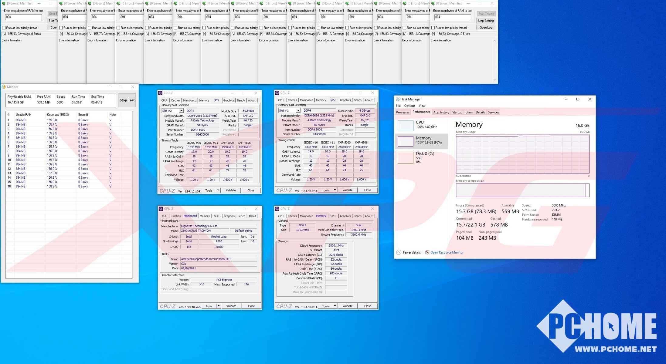 除了在微星主板上进行测试,威刚还使用技嘉 Z590 AORUS 太极主板进行同样的测试。结果显示,内存同样可以超频至 5600MHz,并通过 MemTest 测试。遗憾的是,两张截图中均不能看出 CPU 的信息,只能看到 CPU 满载时频率稳定 4.8GHz。