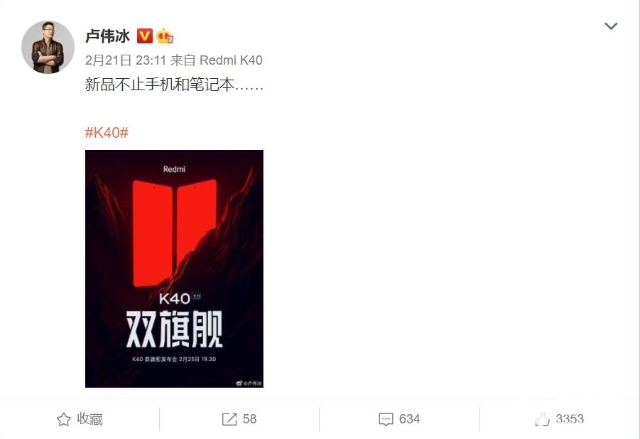 Redmi K40系列发布会还有几天就要开始了,届时大家就能见到传闻已久的Redmi K40系列。除了K40系列之外,Redmi品牌总经理卢伟冰还表示,发布会上会有新品亮相。