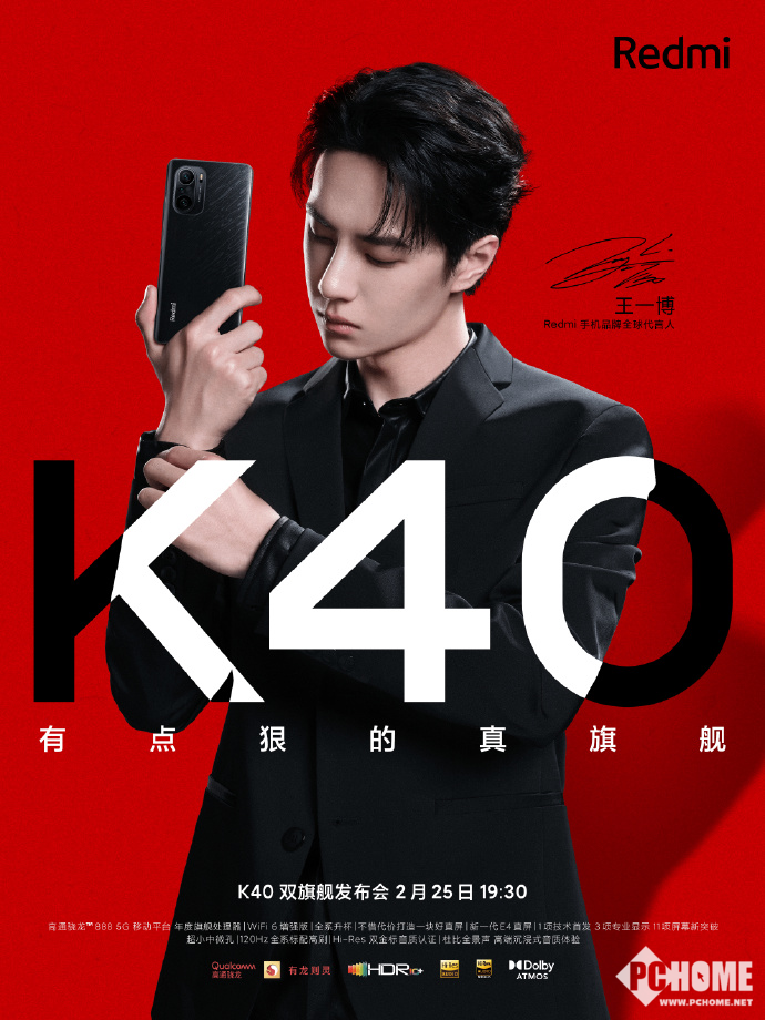 Redmi K40系列将于2月25日正式与大家见面,随着发布日的临近,预热活动也陆续开启。今天,官方发布海报展示了代言人王一博硬核新造型,以及Redmi K40黑色版的完整外观造型。