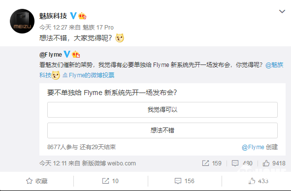 今天中午,魅族Flyme官微就发起了一项投票,询问大家“要不单独给Flyme新系统先开一场发布会?”