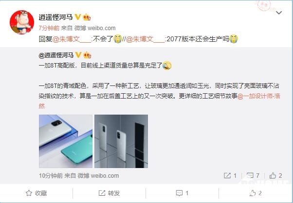 一加科技@逍遥怪河马指出,一加8T青域配色采用了一种新工艺,让玻璃更加通透润如玉光,同时实现了亮面玻璃不沾染指纹的技术,算是一加在后盖工艺上的又一次突破。