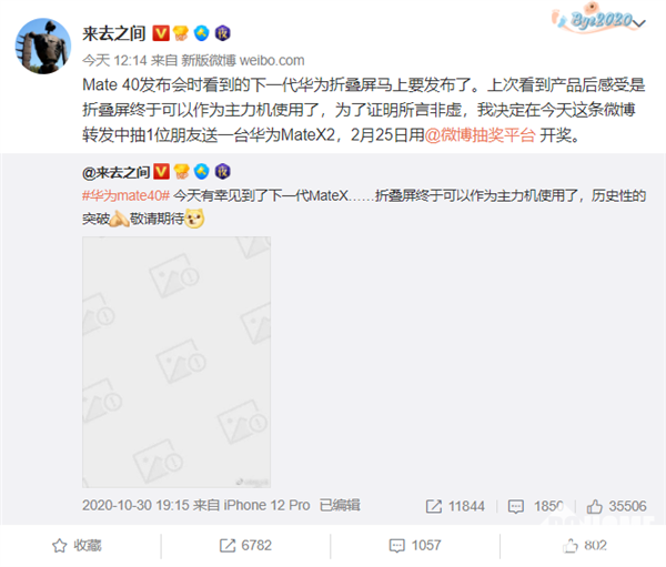 @来去之间 发微博称:“Mate 40发布会时看到的下一代华为折叠屏马上要发布了。上次看到产品后感受是折叠屏终于可以作为主力机使用了,为了证明所言非虚,我决定在今天这条微博转发中抽1位朋友送一台华为MateX2。”