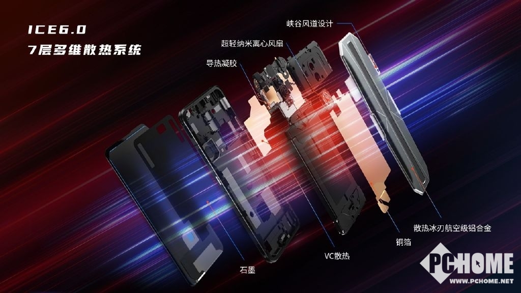 随后,倪飞还公开了红魔6散热规格,其采用了业界独创内置风扇+峡谷风道组合风冷,加上VC液冷(行业最薄0.33mm)、导热铜箔、导热凝胶、高导热石墨、航空级铝合金散热冰刃,最高七层多维散热系统。