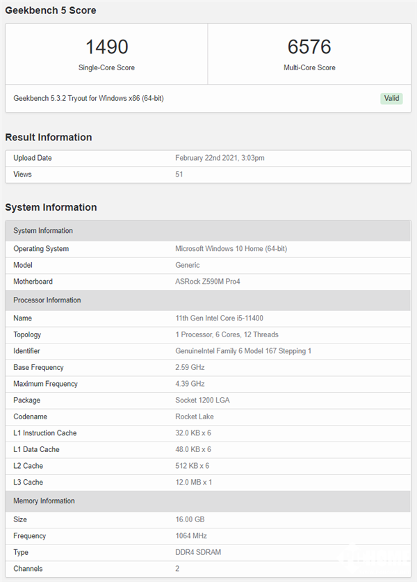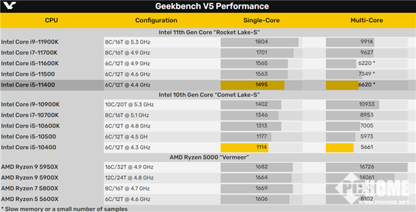 在陆续看过i9、i7系列高端新型号的表现之后,Rocket Lake家族最低端的i5-11400终于出现在了GeekBench 5数据库中,6核心12线程,频率2.6-4.4GHz,二级缓存3MB,三级缓存12MB。