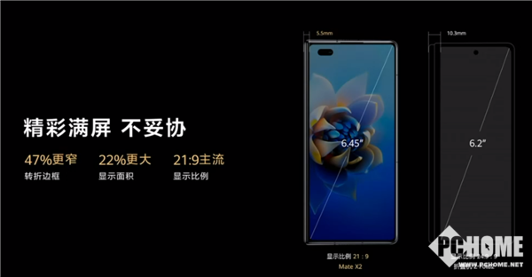 折叠后的外屏方面,Mate X2是6.45寸屏幕,相比Z Fold2手机,边框减少了47%,显示面积大了22%,显示比例也是更主流的21:9。