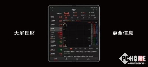 而在炒股方面,华为Mate X2的宽屏也带来了桌面级的炒股体验,股票代码列表、K线图、公司新闻等数据一应俱全。