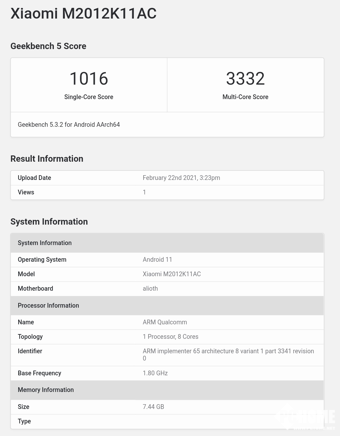 该机单核成绩为1016,多核成绩为3332,配备8GB内存,预装Android 11系统。