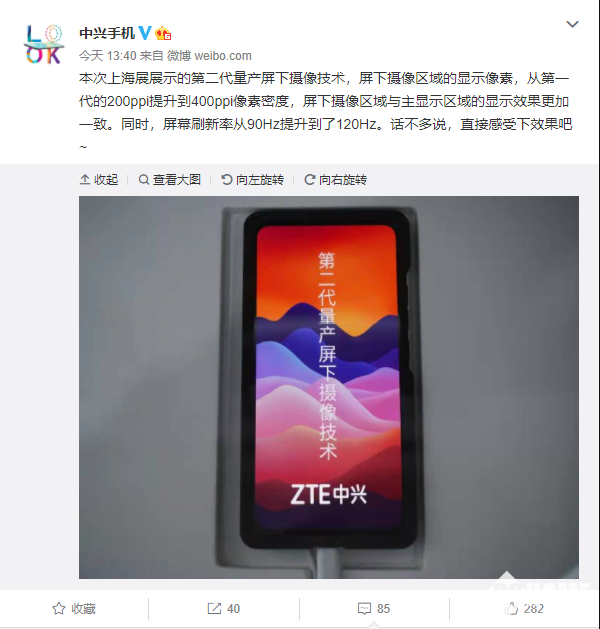 据了解,本次中兴展示的是第二代量产屏下摄像技术,屏下摄像区域的显示像素,从第一代的200ppi提升到400ppi像素密度,屏下摄像区域与主显示区域的显示效果更加一致。同时,屏幕刷新率从90Hz提升到了120Hz。