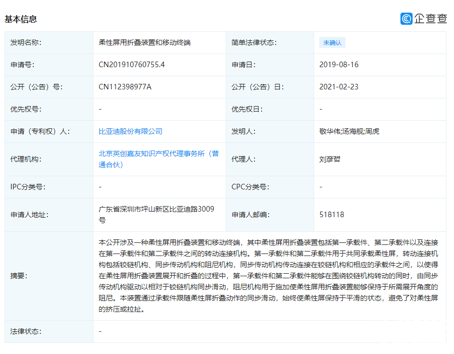 根据企查查数据显示,比亚迪股份有限公司在2021年2月23日新增一项发明专利,其专利名称为“柔性屏用折叠装置和移动终端”,公开号为 CN112398977A。