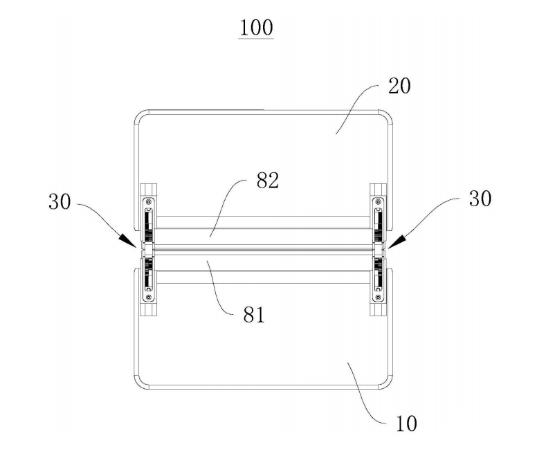 同步传动机构传动连接在铰链机构和相应的承载件之间,以使得在柔性屏用折叠装置展开和折叠的过程中,第一承载件和第二承载件能够在围绕铰链机构转动的同时,由同步传动机构驱动以相对于铰链机构同步滑动,阻尼机构用于施加使柔性屏用折叠装置能够保持于所需展开角度的阻尼。