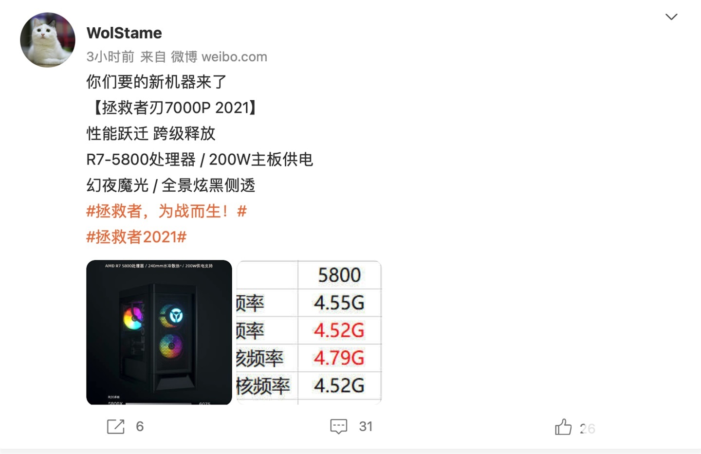 联想作为全球电脑市场的领导企业,致力于用户带来最好的产品和服务。就在昨天,联想中国游戏台式机产品规划经理 @WolStame 发出消息表示,拯救者刃 7000P 2021 即将上市,这款台式机不仅外貌酷炫,还搭载了 AMD 面向 OEM 推出的 R7 5800 处理器。