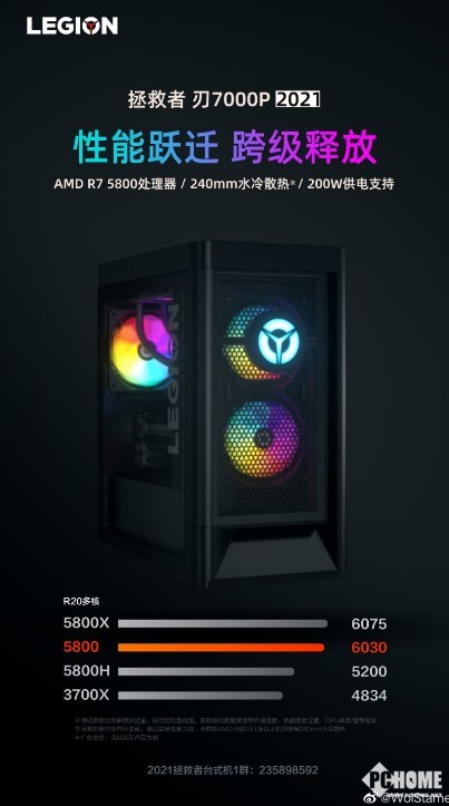 根据官方的预热海报,拯救者刃 7000P 2021 台式机搭载了R7 5800 处理器,采用 240 水冷散热,主板可提供 200W供电。 @WolStame称其性能跃迁,跨级释放。跑分方面,R7 5800 与AMD 面向消费者发布的 R7 5800X 几乎相同。