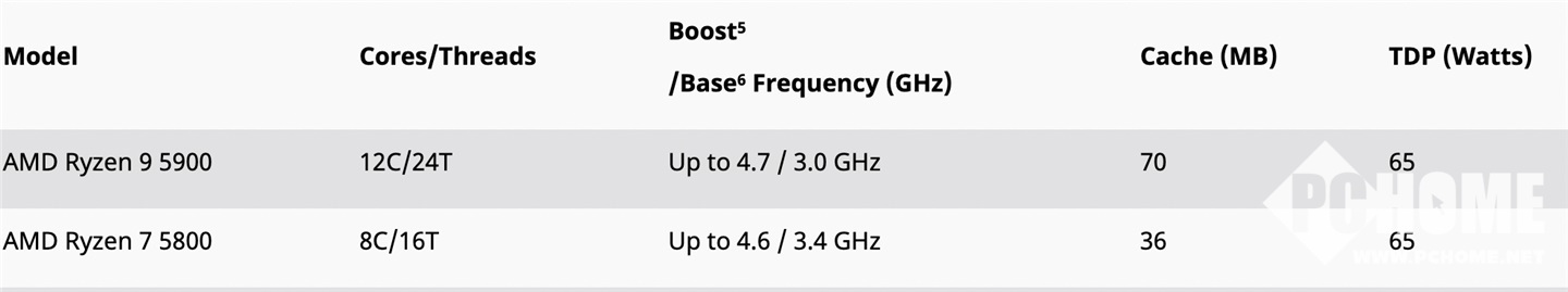 相比 105W TDP 的 R9 5900X 和 R7 5800X,65W 的 R9 5900 和 R7 5800 不仅主频大幅降低,加速频率也降低了 0.1GHz。AMD 表示,R9 5900 和 R7 5800 是仅用于 OEM 的打造的整机产品。