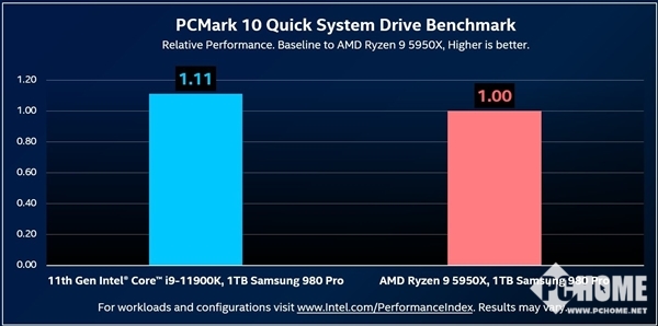 测试中,Intel实验室使用的是三星980 PRO 1TB M.2 NVMe固态盘,这可以说市面上最好的PCIe 4.0 SSD了。在基于Intel酷睿i9-11900K和AMD锐龙9 5950X搭建的平台中,PCMark 10系统存储评估中,前者比后者跑分多出11%。