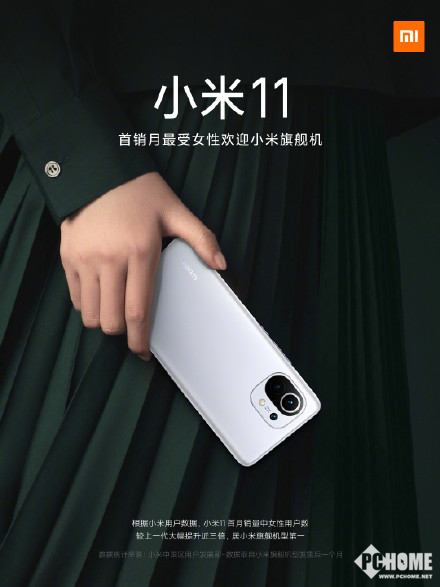 从发布的海报来看,根据小米用户数据统计,小米11首月销量中女性用户数较上一代大幅提升近三倍,居小米旗舰机型第一,该数据取自小米旗舰机型发售后一个月。