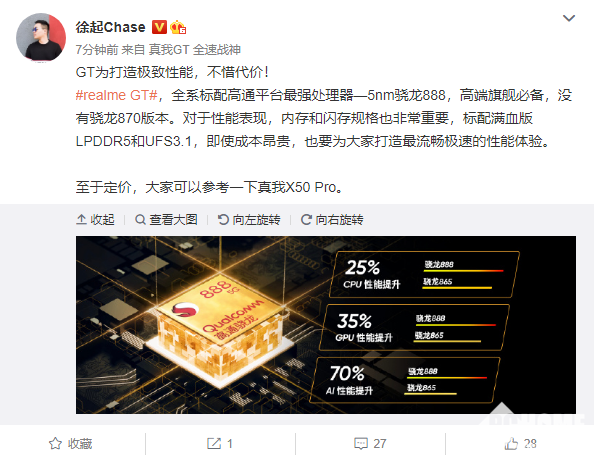 另外,徐起还透露,此次realme GT为打造极致性能不惜代价,将全系标配高通平台最强处理器骁龙888,并未向友商学习配备骁龙870来拉低售价。