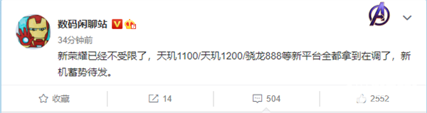 今日,博主@数码闲聊站透露,新荣耀已不再受限,荣耀已拿到天玑1100、天玑1200和高通骁龙888等一系列新平台。