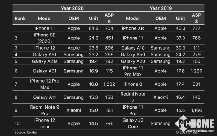 根据调研机构Omdia的数据,iPhone 11是2020年销量最多的智能手机,销量高达6480万,其次就是2020款iPhone SE,销量为2420万。