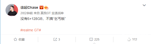 2月25日上午,realme宣布realme GT定价将会低于2999元,不少网友表示搭载骁龙888的realme GT价格太香了。除此之外,realme副总裁徐起还表示,realme GT不高6+128GB的“乞丐版”。