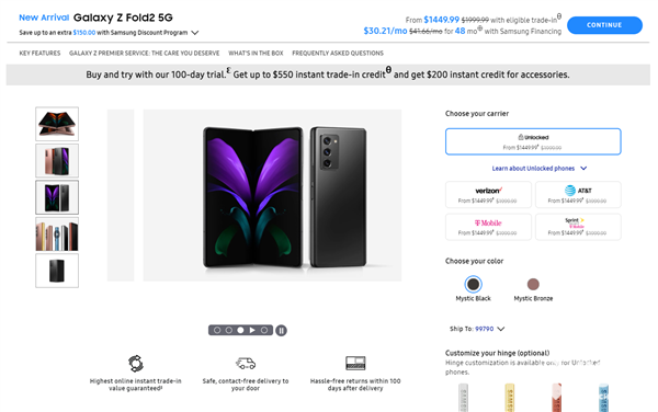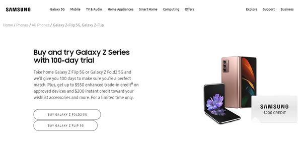 根据官方介绍,如果客户购买了Galaxy Z Flip 5G或Galaxy Z Fold2 5G手机,可享受100天的试用期,即在交货后100天内可享受无理由有退货服务。此外,以上两种机型还享受最高550美元的以旧换新服务。