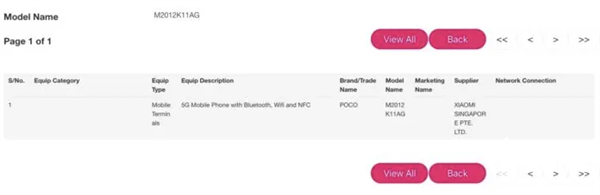 报道指出,小米POCO 5G新机已经获得IMDA认证,认证页面显示小米POCO 5G新机的型号为M2012K11AG。