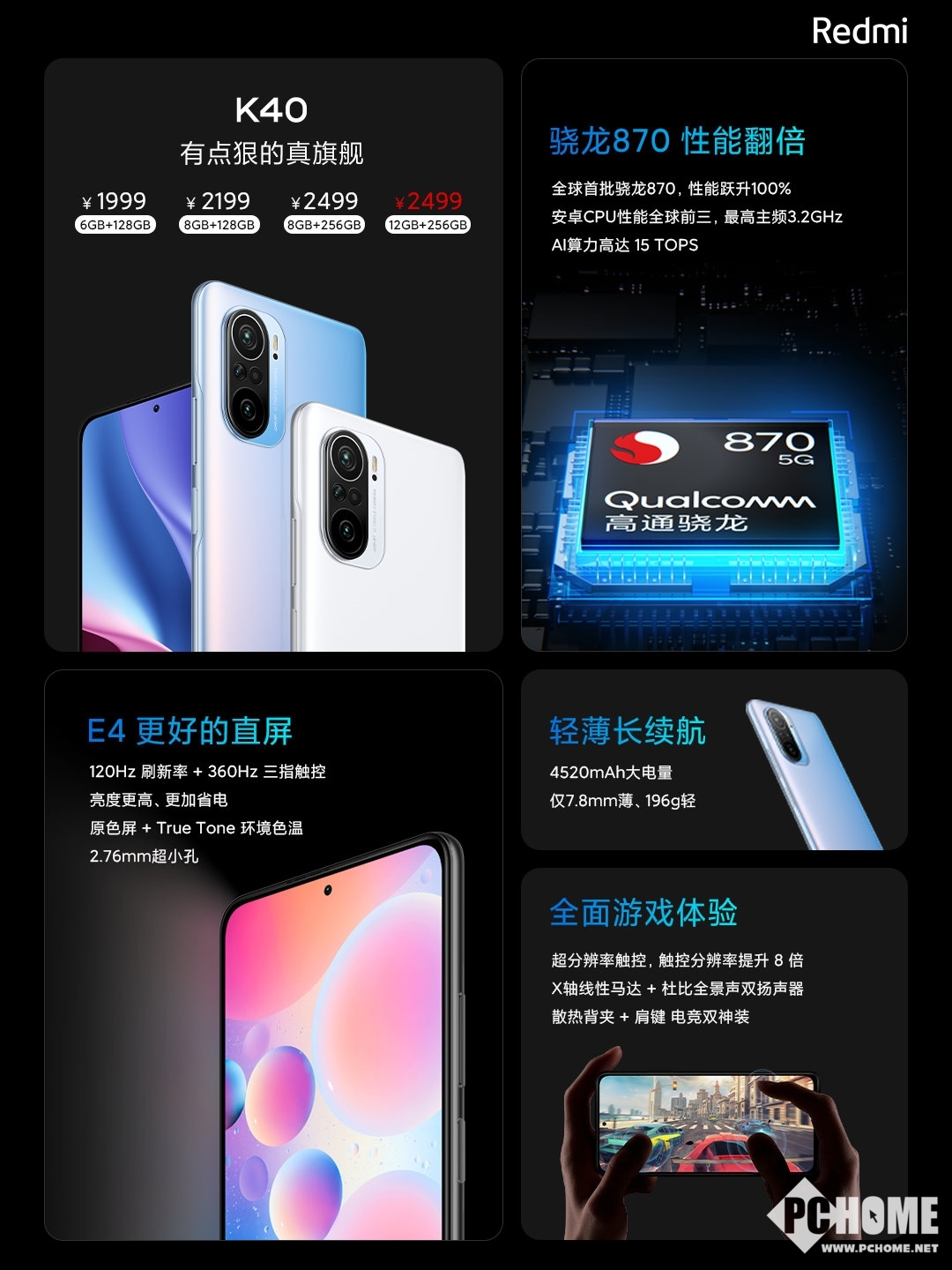 Redmi K40提供四个版本,价格分别是:6+128GB 1999元、8+128GB 2199元、8+256GB 2499元、12+256GB 2699元。