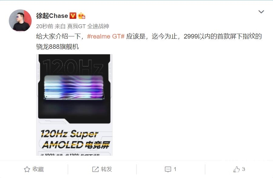 realme GT已公布售价为2999元以下,它也因此吸引了不少手机爱好者的个目光。日前,realme副总裁徐起再次发布消息,表示realme GT是迄今为止2999元以内的首款屏下指纹的骁龙888旗舰机。