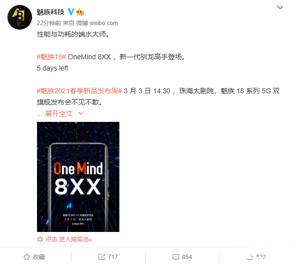 同时,官方还透露了魅族18 标准版配置信息,称其为性能与功耗的平衡大师,拥有OneMind 8XX技术。