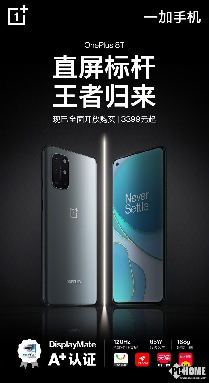 日前一加官方宣布,2020年下半年推出的直屏手机一加8T已全面开放购买,起售价为3399元(8GB+128GB)。