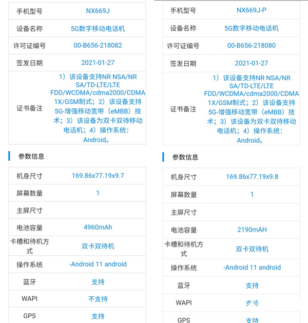 腾讯红魔6系列共有两款机型,分别为红魔6、红魔6 Pro两款。现在红魔6、红魔6 Pro两款新机获得入网许可,型号分别为NX669J和NX669J-P。