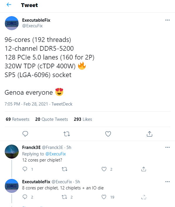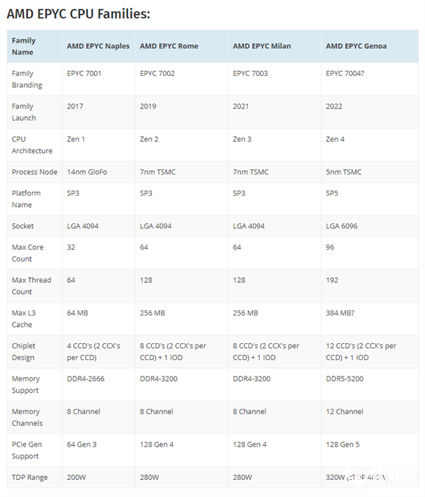 AMD第四代霄龙系列采用5nm工艺、Zen4架构,代号为“Genoa”,产品序列应该是第四代霄龙7004系列。